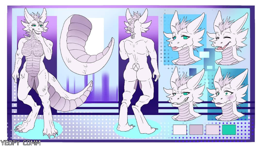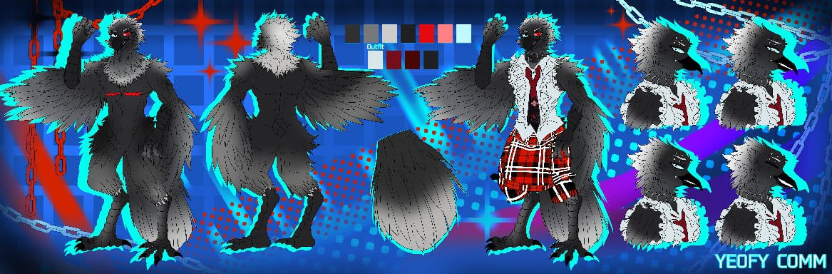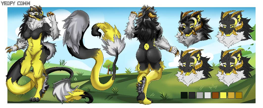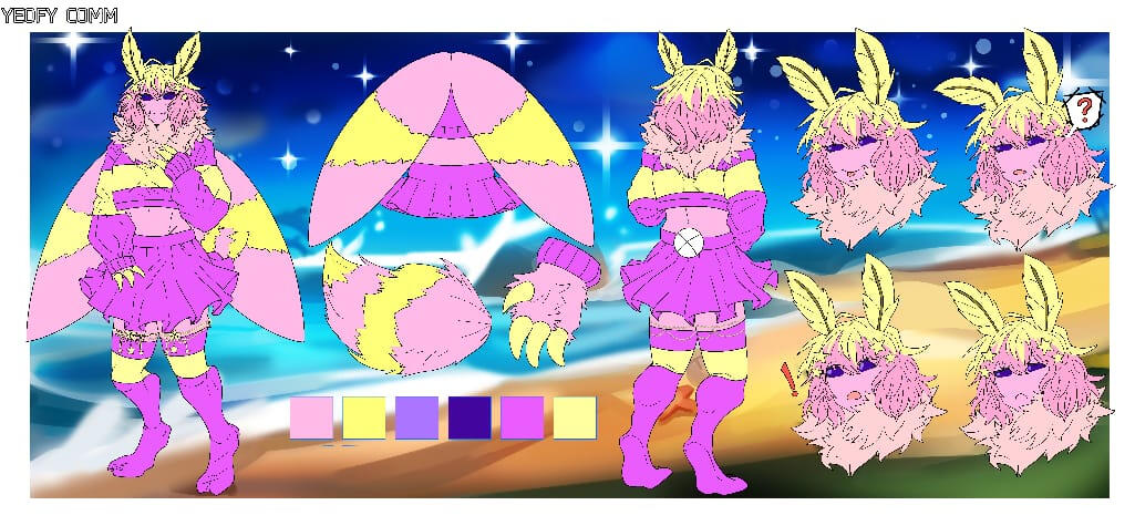 Basic : Front & Back View, 4 Headshots of different expressions variations (1 Rendered, 3 Flats) , A tail closeup, A simple background based on your given theme, a colour palette.